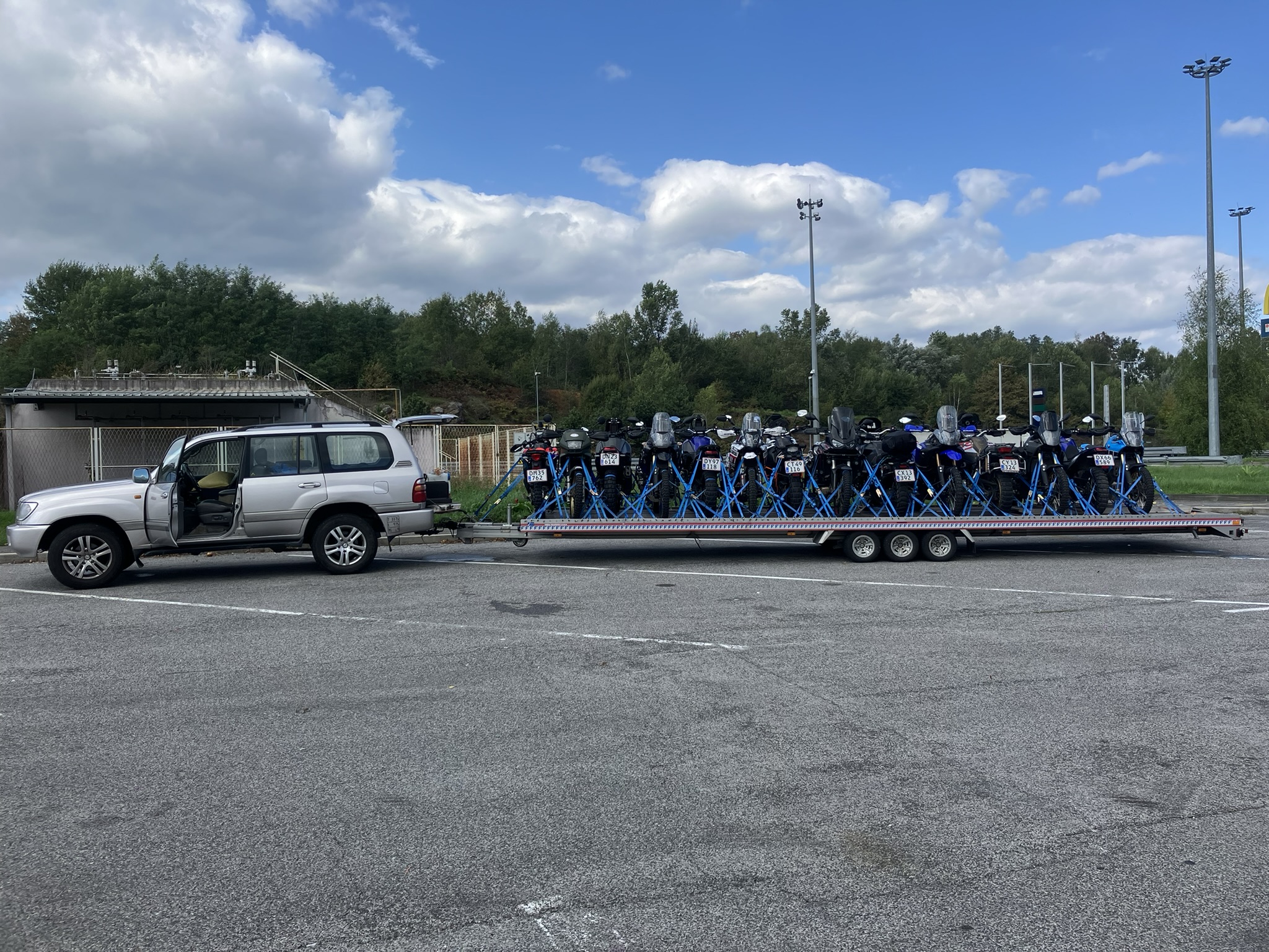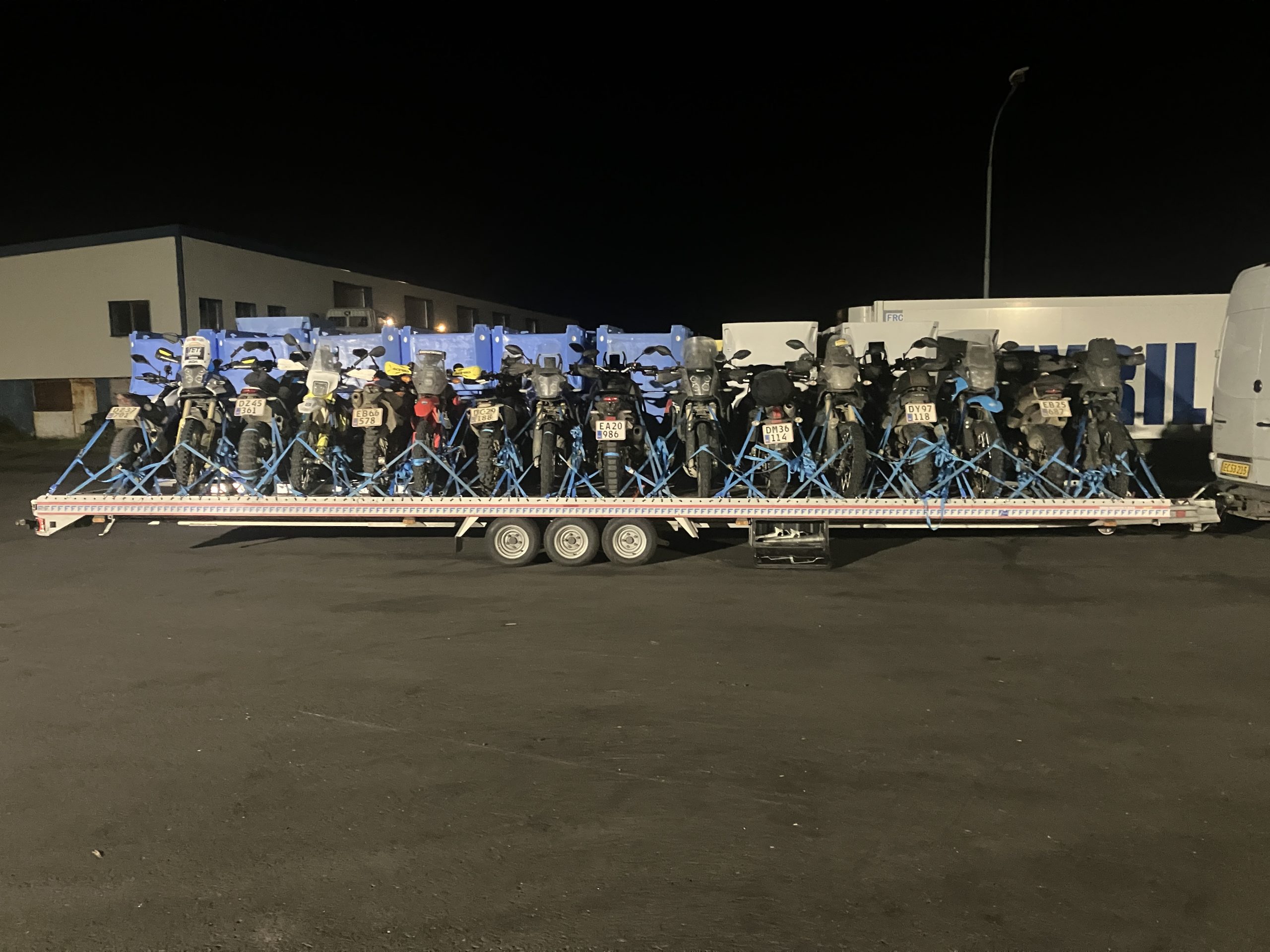 Vi surre din motorcykel med 6 stroppe. Din motorcykel fragtes på en åben trailer, så hvad du måtte have siddende af gps, vindskærme, tanktasker osv. skal du selv sørge for er forsvarligt monteret. Der kommer en del tubulens mellem cyklerne, og da de står vinkelret på køreretningen, bliver din cykel udsat for noget andet end den plejer. Det er dit eget ansvar at alt dette er forsvarligt fastspændt.
