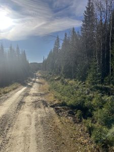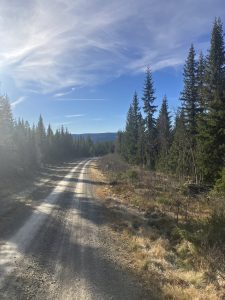 Vi kører i området, der byder på højt beliggende grusveje, i øde områder. Mod vest har vi de mere barske fjelde og øst på bløde bakker med skove så langt øjet rækker.